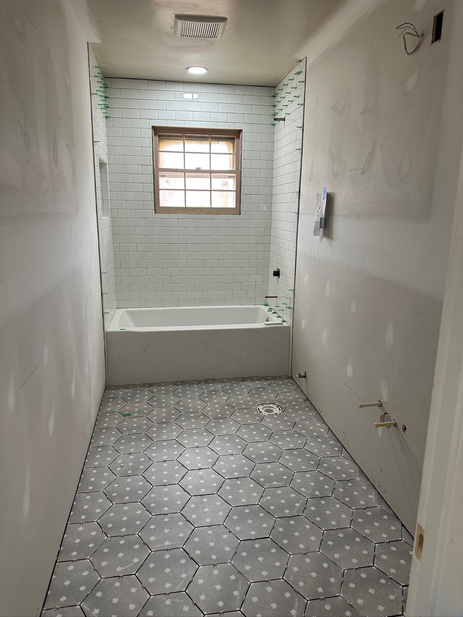 Once the plans were finalized, it was time to order materials. We use a massive shared spreadsheet—and I mean massive—to track everything going into the house: baseboards, light fixtures, vanities, faucets, cabinet knobs… if it belongs in the home, it’s on the list. My inspiration usually comes from a mix of Pinterest, past projects, and whatever the house itself is telling me. This time, I’m completely over the moon about the laundry room flooring—a faux limestone tile that is absolutely incredible and ended up setting the tone for more than one space.